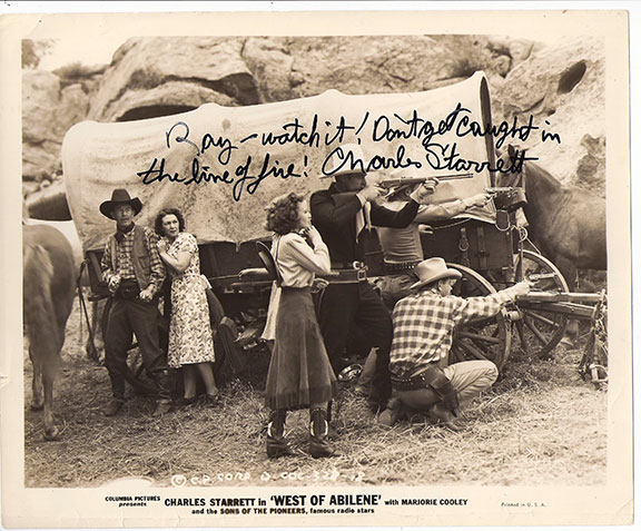 STARRETT, Charles Durango (1904-1988). American cowboy star of innumerable second features of the 30’s and 40’s. Inactive since 1952. Best noted for Sagebrush Heroes and Last Days of Boot Hill. Attractive movie still from West of Abilene . Great vintage photograph of a group of cowboys alongside a wagon, shooting it out. Nice action scene. Boldly inscribed: “Ray, watch it! Don’t get caught in the line of fire! Charles Starrett”. As nice as it gets................ $135.00 |
