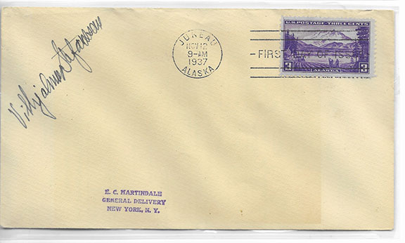 STEFANSSON, Vilhjalmar (1879-1962) Arctic explorer. He first visited the arctic in 1906-1907. From 1913-1918 he was the leader of the Canadian Arctic Expedition. FDC with a US 3-cent Alaska postage stamp cancelled Juneau, Alaska NOV 12, 1937. Hand signed with his full signature Vilhjalmar Stefansson. Scarce in this format. In very good condition.....................$125.00![]() |