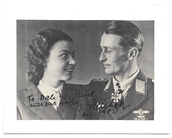 STEINHOFF, Johannes (1913-1994). German fighter pilot during WWII. One of the first to fly the Messerschmitt ME 262 in combat. He was shot down 12 times. High scoring Ace credited with 176 victories. He is also remembered for walking with President Reagan in 1985 and placing a wreath at the Bitberg Cemetery. Steinhoff during the war had a tire problem while taking off at an airfield. The plane crashed and he spent 2 years in a hospital because of severe burns which visibly left many scars. His eyelids were rebuilt by a British surgeon. Paper portrait affixed to a 4”x6” card of Steinhoff looking at a woman. Inscribed and signed and dated: To Dale W, Paul with best wishes J. Steinhoff, Dec 1983”. In fine condition................................ $75.00