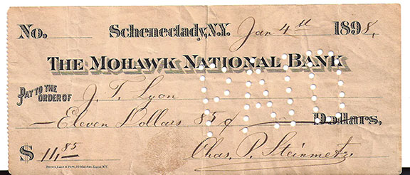 STEINMETZ, Charles P. (1865-1923). German/American electrical engineer. Invented and patented over 100 inventions. Honored on a U.S. Postage Stamp. Pertly printed D.S. Signed bank check, Schenectady, N.Y. 1/4/98, accomplished by Steinmetz, payable to J.T. Lyon. Cancellation holes do not affect Steinmetz’s full signature. A V/G example................................... $250.00![]() |
