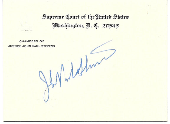 STEVENS, John Paul (1920-2019). American lawyer, nominated to the Supreme Court by President Gerald R. Ford. Served as Associate Justice 1975 until his retirement in 2010. This appointment filled the vacancy of William O. Douglas. Stevens is known for his dissents in Texas v. Johnson and Bush v. Gore. Supreme Court of the United States, Chambers Card of John Paul Stevens. Stevens has signed his name with a wonderful full signature not the fast scrawl as is in may cases on souvenir items. Mint condition........$85.00