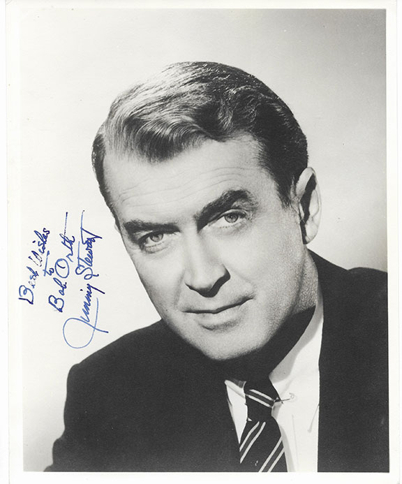 STEWART, Jimmy (1908-1997). American actor and military officer. One of the most popular stars in film history. His career spanned over 55 years and included 80 films. He was the highest-ranking actor in military history. Nominated for 5 Academy Awards. Wonderful B&W photograph, 8”x10” close-up head and shoulders pose. Inscribed to President of the Film Institute: “Best wishes to Bob Orth Jimmy Stewart.” Note on verso indicates received August 61. In fine condition......................$195.00![]() |
