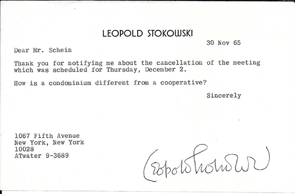 STOKOWSKI, Leopold (1882-1977). British-born American conductor noted for his innovative orchestration. Brilliant and flamboyant he led the Philadelphia Orchestra from 1912 to 1936. It was under Stokowski’s baton that they played the music for Disney’s Fantasia. T.L.S., 8.5”x5.5”, November 30, 1965 to Mrs. Schein (lived in same building as Stokowski) . He writes in full: “ Thank you for notifying me about the cancellation of the meeting which was scheduled for Thursday, December 2. How is a condominium different from a cooperative? Sincerely, Leopold Stokowski.” Signed with a huge signature ...........................$125.00