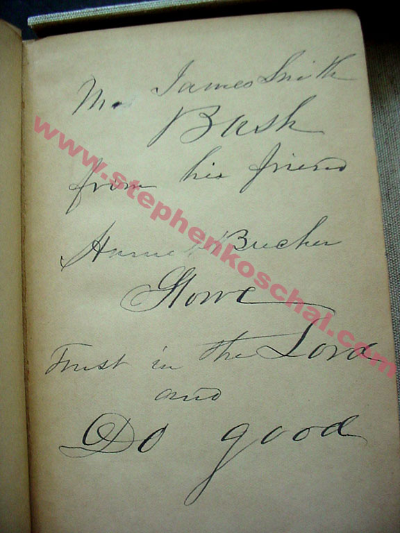 Her book: Uncle Tom’s Cabin Or Life Among The Lowly, Universal Edition, Houghton Mifflin Company, Riverside Press, 1892. Inscribed: “Mr. James Smith Bush from his friend Harriet Beecher Stowe, Trust in the Lord and Do Good.” Book in G-VG condition, pictorial cover. Binding nice and tight, pages browning from age. Most copies offered by dealers of this book will have a slip tipped in signed by Stowe. It is scarce to find a copy actually inscribed and signed. James Smith Bush was an Episcopal Priest and religious writer. Ancestor of the Bush political family. He was the father of business magnate Samuel Prescott Bush. Grandfather of U.S. Senator Prescott Bush, great grandfather of former U.S. President George H.W. Bush and great grandfather of U.S. President George W. Bush. James Smith Bush died in 1889 and this copy was printed in 1892. Apparently someone in the Bush family possibly a son or daughter of James Smith Bush met Harriet Stowe and asked that the book be inscribed to their late father an old friend of Mrs. Stowe ......................................$7,500.00 0 ![]() |