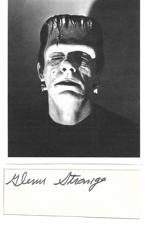 STRANGE, Glenn (1899-1973). American actor who mostly appeared in western films. Best remembered for his role as the Frankenstein monster in 3 films during the 1940’s. He also played the bartender in the TV series “Gunsmoke.” Very scarce bold signature on a slip. In excellent condition......................$450.00 |