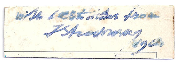 STRAVINSKY, Igor (1882-1971). Russian composer, regarded as the leader of the Futurist Group in modern music. Sentiment signed and dated: “with best wishes from I.Stravinsky, 1964”. Light scattered damp staining not affecting his desirable signature .................................$195.00![]() |