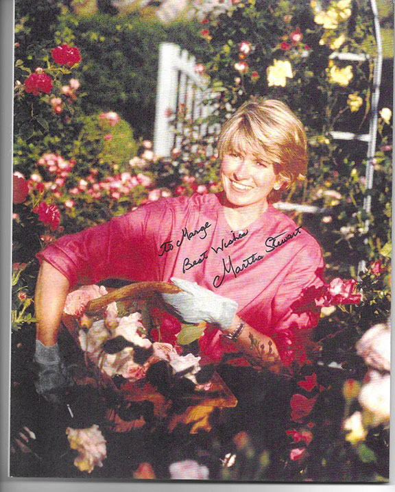 STEWART, Martha (1941- ) American retail businesswoman, convicted felon. Stewart resigned her position on the board of directors of the New York Stock Exchange. She was indicted by the government on 9 counts of securities fraud and obstruction of justice. She was sentenced to 5 months in a federal correction facility. Fabulous 8”x10” color vintage photo of Martha Stewart surrounded by colorful flowers. Inscribed: “To Marge Best Wishes Martha Stewart.” Beware of the many forgeries of Martha Stewart being offered on the Internet. Mounted to a foam board. Very fine condition......................................$45.00