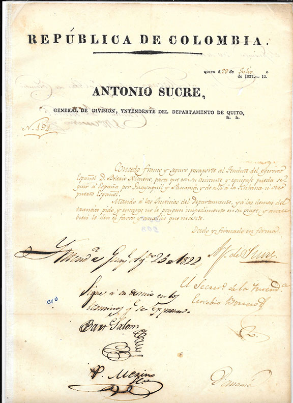 Partly printed document signed, one full page, measures appx. 8”x12” headed “Republica De Columbia, Quito July 29, 1822. This is a pass to permit a military officer for his up coming journey from Colombia via panama to Habana, Cuba. A wonderful signature of Sucre. In addition several other has signed this document as well. Professionally laminated keeping this document if fine plus condition. All writing nice and dark..................................$895.00