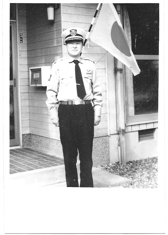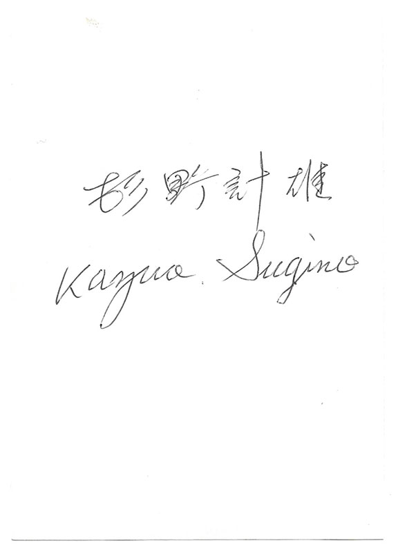 SUGINO, Kazuo (1921-1999) Japanese aviator, fighter Ace of the Japanese Imperial Navy during WWII. High scoring Ace credited with 34 victories. He was a member of the Taichung Fighter Corps Suicide Squad. Very uncommon photograph, 3”x5” B&W, full length of the Ace standing in front of a Japanese Flag. On the verso he has signed his name with a double signature, one in Japanese and the other in English. Very fine condition ..................................$110.00