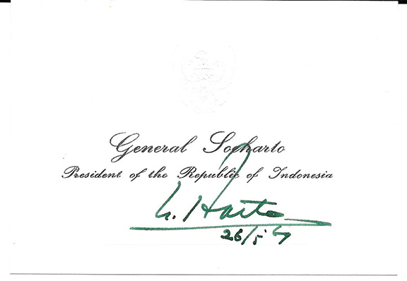 SUHARTO (1921-2008). Second President of Indonesia. He held that office for 31 years (1968-1998). He rose to Major General following Indonesia’s independence. Like many Javanese, Suharto has only one name. His very rare imprinted visiting card “General Suharto, President of the Republic of Indonesia.” Hand signed and dated “26/5/69.” Blind stamped Seal of the Republic of Indonesia. Mint condition.................................SOLD![]() |