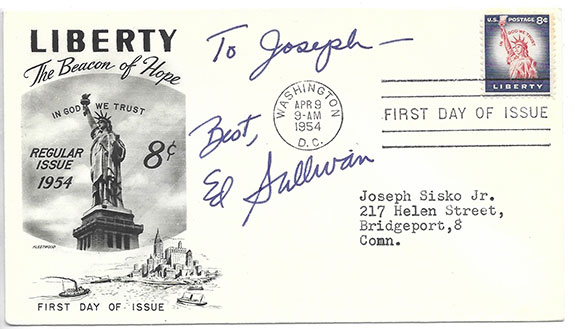 SULLIVAN, Ed (1901-1974). American television host best known for The Ed Sullivan Show. Banned from his show was The Doors and Bob Dylan. First Day Cover commemorating “Liberty The Beacon of Peace.” Cachet of The Statue of Liberty. Affixed is a U.S. 8 cent Liberty postage stamp, cancelled Washington, D.C. Apr 9, 1954. Inscribed: “To Joseph- Best, Ed Sullivan.” In Mint condition.....$95.00 |