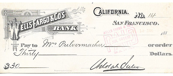SUTRO, Adolph (1830-1898). Born to a Jewish family in Germany. He became a mining engineer and politician. Served as the 24th Mayor of San Francisco. He designed and constructed the Sutro Tunnel for the Comstock Lode in Virginia City, Nevada. Choice bank check on the San Francisco, California Wells Fargo & Co for $30 made payable to Mrs. Pulvermacher. Check exhibits a Bank/Paid stamp dated July 10, 1890. No cancellation marks touch Adolph Sutro’s magnificent signature. In very fine condition...........$187.50