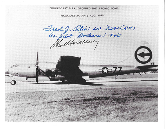 SWEENEY, Charles W. (1919-2004) Pilot of Bockscar. OLIVI, Fred J. (1922-2004). Co-Pilot of Bockscar. Photograph of Bockscar, full length on the runway, 8”x10”, B&W. Signed Charles Sweeney and Fred. J. Olivi adding “LTC USAF (Ret) Co-Pilot Bockscar 1945.”...........$95.00 ![]() |