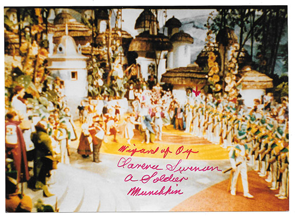 SWENSON, Clarence (1917-2009). Played one of the 25 soldiers in the Wizard of oz. Color photograph 5”x7” of Judy Garland looking over the Munchkin soldiers. Signed in red ink: “Wizard of Oz, Clarence Swenson, A Soldier, Munchkin.” In fine condition..................................$37.50 |