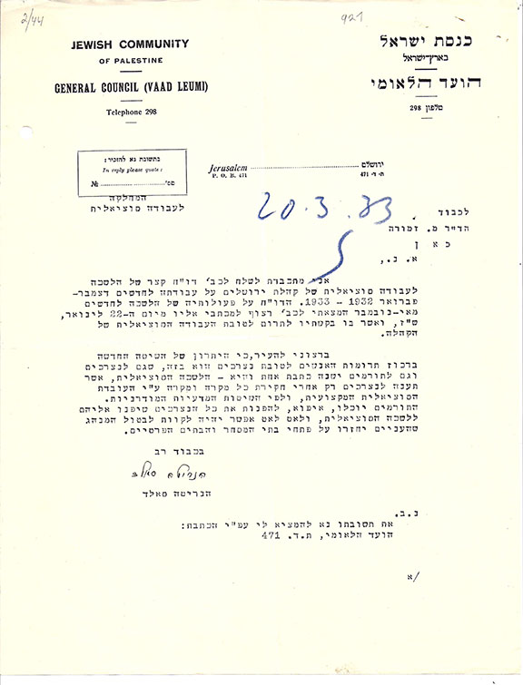 SZOLD, Henrietta. (1860-1945). American Jewish Zionist Leader. Medical administrator, she brought 20th century medical care to Palestine. Founder and First President of Hadassah. Typed letter signed, one full page, on the imprinted letterhead of The General Council (Vaad Leumi) of the Jewish Community of Palestine. Signed in Hebrew...........$495.00