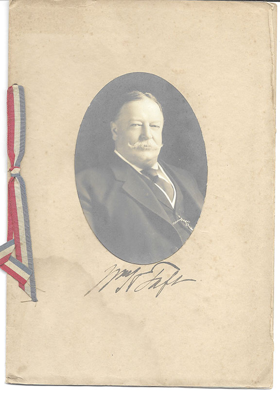 TAFT, William (1857-1930) The 27th President of the United States (1909-19130. Chief Justice of the Supreme Court of the United States. Dinner program and menu and table settings, ten pages plus the covers. Program tied together with a red, white and blue ribbon. Affixed to the front cover is an engraved portrait of President Taft. The President of the United States, with only eleven days left of his presidency, has boldly signed his name under his portrait. As expected at a dinner of 400 people, one would expect a slight water staining on the bottom left of the covers, otherwise quite nice for a program.........................$495.00