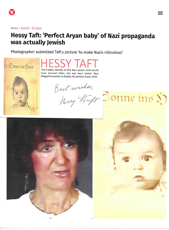 TAFT, Hessy (1934- ) Born in Berlin, this baby was the “Perfect Aryan Child.” Her picture was used in Nazi propaganda. In 1935 her photo won a contest to find the most beautiful Aryan baby. Her image was widely distributed by the Nazi party in magazines and on post cards. Her family was not aware the photographer decided to enter the photo in a contest. Their daughter was selected by Nazi Propaganda Minister Joseph Goebbels as the winner. The photographer knew the family was Jewish but deliberately entered the photograph in the contest because he wanted to make the Nazi’s look ridiculous. Poster with a portrait of Baby Hessy on the cover of a German magazine. In addition on the poster is a portrait of Hessy Taft as she looked some years ago. Affixed to the poster is a card 3”x4.5” with a portrait of Baby Hessy which Taft has signed: “Best wishes, Hessy Taft.” A remarkable historical item. In 1938 her parents were briefly arrested by the SS. Months later the family immigrated to France, then moved to Cuba and onto the United States. While Hessy was living in Germany, if the Nazi’s knew she was Jewish, she would have been killed. in fine condition..................................$87.50