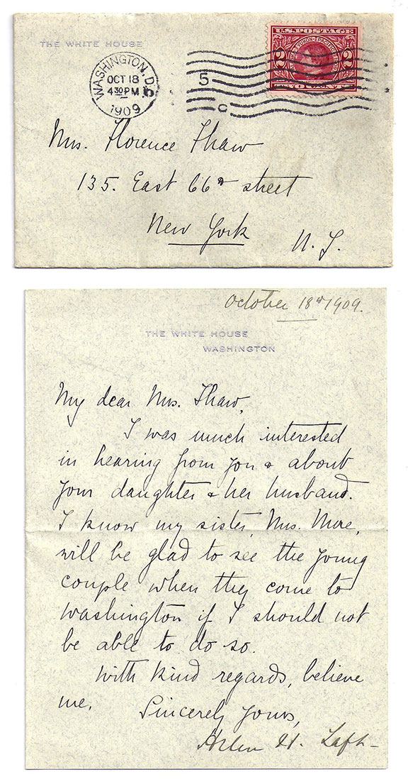 TAFT, Helen H. (1861-1913). First Lady of the United States (1909-1913). Manuscript letter signed, one page, on the imprinted letterhead of The White House, Washington, (DC) October 18,1909. “To My Dear Mrs. Thaw.” Interesting content: “...I was much interested in hearing from you and about your daughter & her husband. I know my sister...will be glad to see the young couple when they come to Washington if I should not be available to do so. With kind regards, believe me...”