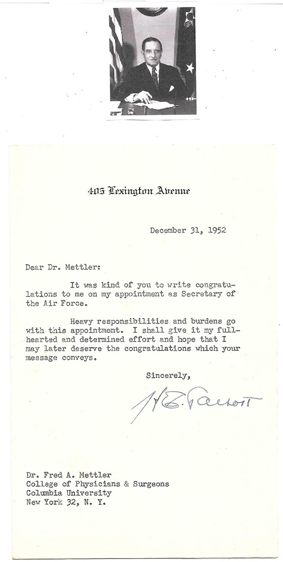 TALBOT, Harold E. (1888-1957). Appointed Third Secretary of the Air Force (under President Eisenhower). He appointed a commission in selecting a permanent site for the Air Force Academy. Founder of the air Force Academy. Typed letter signed, dated December 31, 1952 to Dr. Fred A. Mettler, College of Physicians and Surgeons. Talbot refers to congratulations on his appointment as Secretary of the Air Force. He continues: “Heavy responsibilities and burdens go with this appointment”. Anything hand signed by Talbot can be considered rather uncommon. In excellent condition............................$85.00