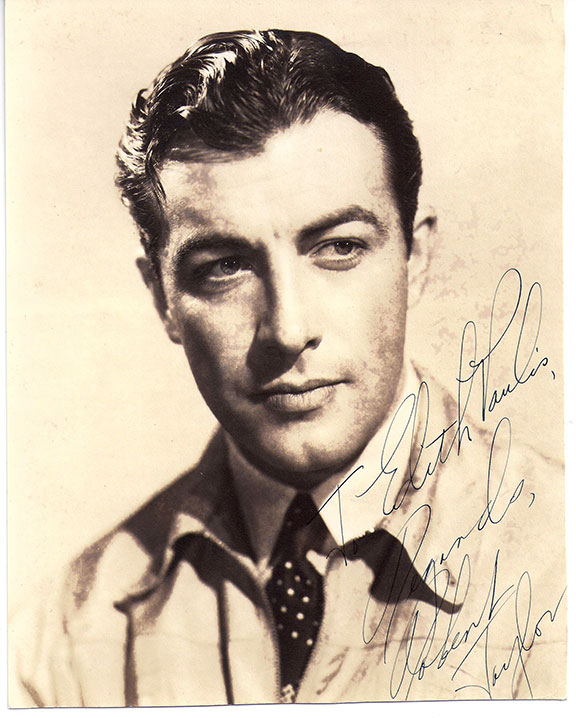 TAYLOR, Robert (1911-1969). MGM’s handsome leading man. Vintage portrait stamped “MGM” on verso. Measures appx: 7.25”x9.25”, head & shoulders pose, inscribed “To Edith Paulis, Regards, Robert Taylor”. Slightly trimmed otherwise in fine condition of an otherwise uncommon portrait................ $165.00 |