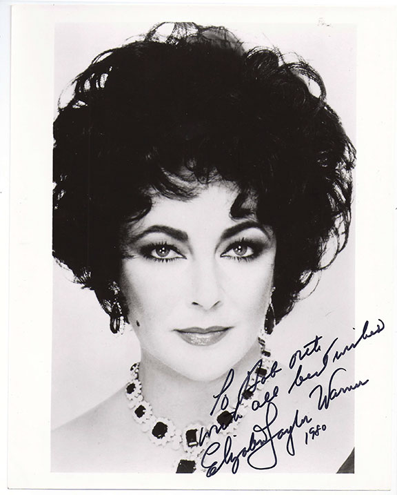TAYLOR WARNER, Elizabeth (1932-2011). British-American actress, child star. Married 7 times, 8 if you include marrying Richard Burton twice. Winner of two Academy Awards for Best Actress. Photograph, 8”x10”, B&W, wonderful head & shoulders pose looking quite serious. Inscribed to her friend: “To Bob Orth, with all best wishes, Elizabeth Taylor Warner 1980”. Bob Orth was President of American Film Archives and was friends with Elizabeth Taylor. In very fine condition..... $475.00 |