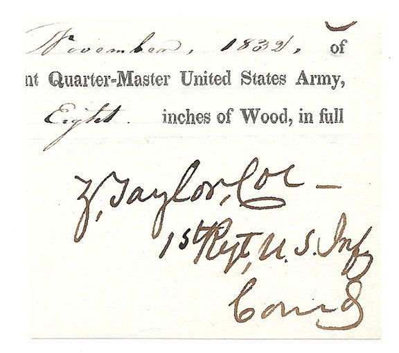 TAYLOR, Zachary (1784-1850). Twelfth President of the United States. Partial document dated November 1832. Signed: “Z. Taylor, Col- 1st Rgt,U.S. Infy,Comd.” A fabulous signature................SOLD