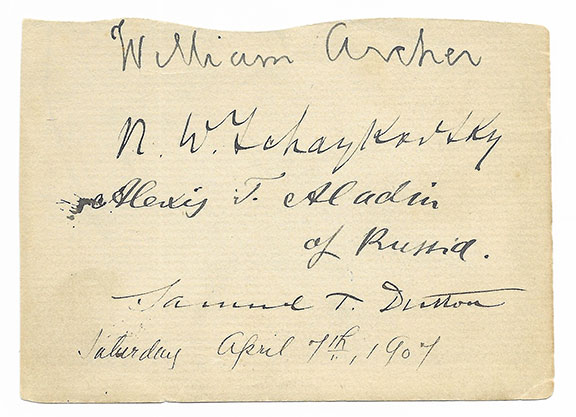 Portion of an album page signed by all four. Dated by Dutton, Saturday April 7, 1907. The two Russian autographs are nearly impossible to locate..........$475.00