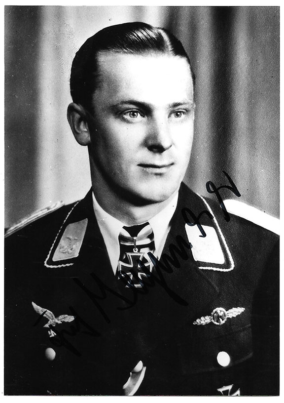 TEGTMEIER, Fritz (1917-1999). German fighter pilot during WWII. Flew with the JG-7 and an Ace credited with 146 victories. Photograph, 4”x6”, B&W, head and shoulders pose in uniform. Awarded the Knight’s Cross of the Iron Cross. Boldly signed with a full signature. Contrast better than what is illustrated here..... $75.00 |