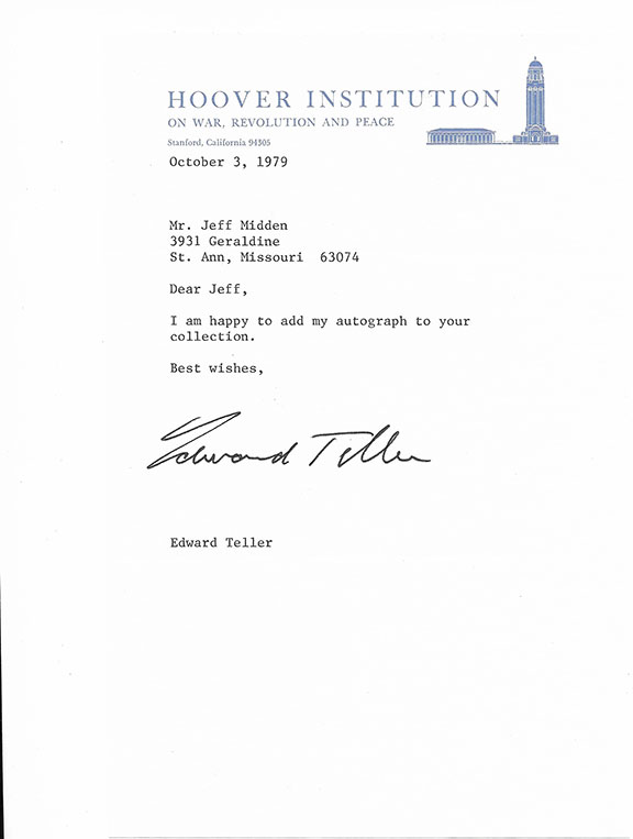 TELLER, Edward (1908-2003) Recipient of the Fermi Award, known as The Father of the H-Bomb. The H-Bomb was first detonated at Enewetak atoll in the Marshall Islands (Nov. 52). This nuclear weapon is 450 times more powerful that the atomic bomb that was dropped on Japan. T.L.S. on the printed letterhead of the Hoover Institution, October 3, 1979, responding to an autograph request. Choice signature. Very fine condition........$295.00