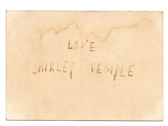 TEMPLE, Shirley (1928-2014). Actress, singer, dancer and major movie star from the age of six. Highly paid child star. Vintage fountain pen signature with the word “Love” by her hand. Penned on a cream colored card, very light water stain across the top of the card but not touching her signature. The earliest signature of Temple we have seen.................................SOLD