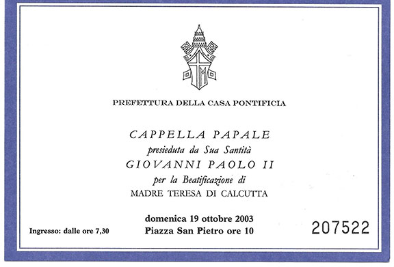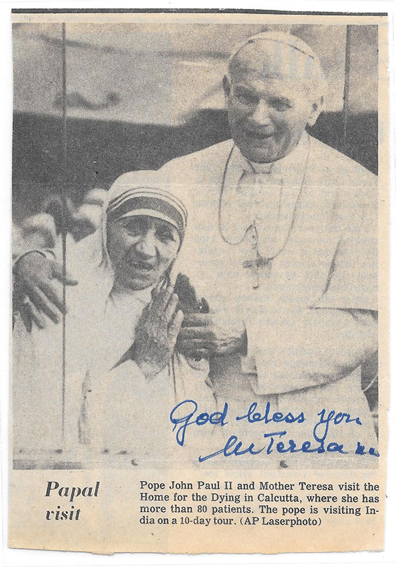 A very scarce newspaper portrait of Mother Teresa and Pope john Paul II. The Pope smiling, has his both arms around Mother Teresa. This photo was taken while the Pope and Mother Teresa was visiting the Home for the Dying in Calcutta. At this time Mother Teresa had 80 patients in the home. The Pope was visiting India on a 10- day tour. Measures 4”x6”, black & white. Mother Teresa has very boldly written: “God Bless you” and signed her name “M. Teresa m.c.” Together with a colorful Mother Teresa prayer card and a Limited, numbered invitation by Pope John Paul for the Beatification of Mother Teresa to be held at the Piazza San Pietro on October 19, 2003. In addition we have included a wonderful original relic. A piece of cloth from one of her robes affixed to the back of a “Madre Teresa” medal which bears her portrait. This was made in Italy and can easily be worn with a silver chain. The collection.......$875.00