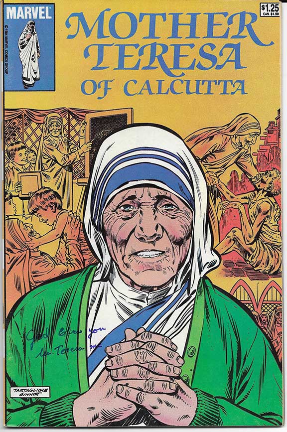 Blessed TERESA of Calcutta (1910-1997). Known as Mother Teresa, a Roman Catholic Religious Sister and Missionary. She was beatified in 2003 and destined to become a Saint. She was canonized on 4 September 2016 by Pope Francis. She is honored in the Catholic Church as Saint Teresa of Calcutta. Marvel Comic Book, Vol.#1, No.1, 1984 issue. This entire comic book is dedicated to Mother Teresa. Signed: “God Bless you, M. Teresa mc” on her portrait on the front cover. In excellent condition......................................$675.00