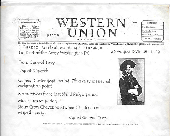 TERRY, General Alfred (1827-1890). Union General, Military Commander of the Dakota Territory. Choice genuine looking by a copy of the western Union Telegram sent by General Terry on 26 August 1876, Rosebud Montana, to the Dept. of the army Washington, DC stating that General Custer is dead. 7th Cavalry massacred, no survivors, much sorrow, Sioux Crow Cheyenne Pawnee Blackfoot on warpath . Quite attractive...............SOLD