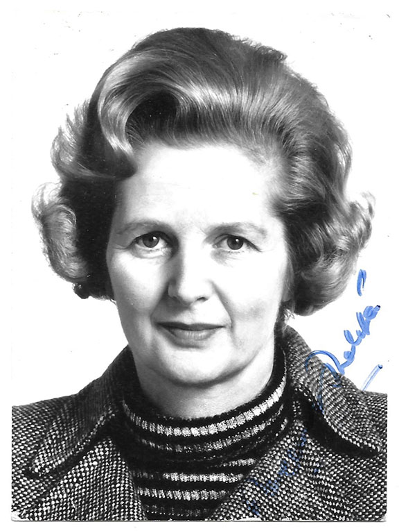 THATCHER, Margaret (1925-2013). First female Prime Minister of England (1979-1990). Longest serving PM of the 20th century. Known as the “Iron Lady.” Choice B&W photograph, head and shoulders pose, 3”x4” signed. In fine condition.................$175.00 |