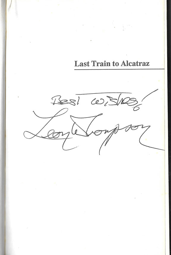 THOMPSON, Leon “Whitey” (1923-2005). American criminal, bank robber. Former Alcatraz prisoner. Released from Alcatraz on Oct. 25, 1962. His claim to fame is he is one among a handful of men ever to be released directly from Alcatraz to San Francisco. His book, Last Train to Alcatraz An Autobiography, wrappers 9th Printing 1991 380 pages with interesting photographs. On the half title page Thompson has signed adding a two word sentiment: “Best wishes Leon Thompson.” In V/G condition ..................................$47.50