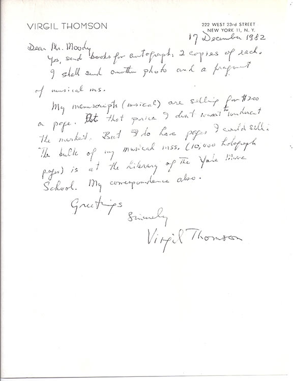 THOMSON, Virgil (1896-1988). American composer; music critic. Associated with Gertrude Stein in Paris. Uncommon autograph letter signed, one page, on his name imprinted stationery. New York, 17 Dec. 1982. Interesting content:….”send books for autograph, 2 copies of each, I shall send another photo and a fragment of musical ms. My manuscripts (musical) are selling for $200 a page. At that price I don’t want to undercut the market. But I do have pages I could sell. The bulk of my musical mss. 10,000 holograph pages is at the library of the Yale Music School.” A wonderful content letter being full aware of the current values of his papers. Most interesting and in fine condition............................................SOLD