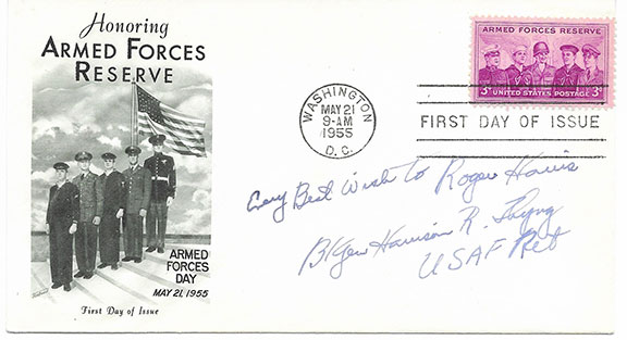 THYNG, Harrison R. (1918-1983) U.S. fighter pilot and General in the U.S. Air Force. He is one of only 6 USAF fighter pilots to be an Ace in two World Wars. He was one of the first fighter pilots to see combat in Europe. Eight kills in WWII and seven kills in Korea. First Day Cover commemorating Armed Forces Reserve (1955) Armed Forces Reserve postage stamp cancelled Washington, May 21, 1955. The general has inscribed and signed as follows: “Every Best Wish to Roger Harris B/Gen Harrison R. Thyng USAF Ret”. In very fine condition. Not a common autograph......................................SOLD