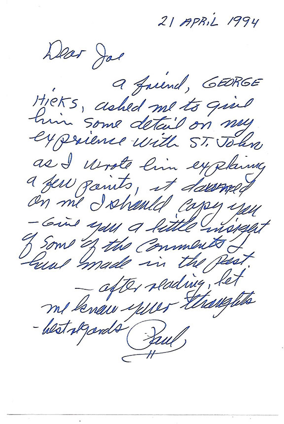 TIBBETS, Paul (1915-2007). Brigadier General in the U.S. Air Force. Best remembered for being the pilot of the Enola Gay which dropped the Atomic Bomb on Hiroshima on August 6, 1945. Very uncommon autograph letter signed , “Paul”, 1 page, April 21, 1994 to the now deceased autograph dealer Joe Fawls. Tibbets writes: “Dear Joe, A friend, George Hicks, asked me to give him some detail(s) on my experience with St. John as I wrote him explaining a few points, it dawned on me I should copy you-give you a little insight of some of the comments I have made in the past. – after reading, let me know your thoughts....” Fine condition..................$150.00