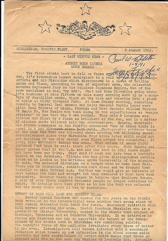 Original military daily newspaper “Submarines, Pacific Fleet, Press, 9 August 1945.”