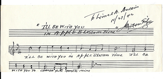 VON TILZER, Albert (1878-1956). American songwriter, younger brother of Harry Von Tilzer. Albert Von Tilzer wrote hundreds of songs including “Take me Out To The Ball Game”, “Apple Blossom Time”, Oh By Jingo”. AMuQS, Von Tilzer has penned two lines of music and the words to “Ill Be With You In Apple Blossom Time” on printed music paper measuring 3.75x9”. He has written: “I’ll be with you in Apple Blossom Time I’ll be with you to change your name to mine”. Inscribed, signed and dated: “11/27/42”. A fabulous eye appealing example..........SOLD