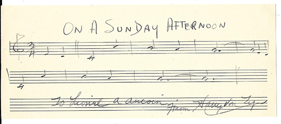 VON TILZER, Harry (1872-1946). Very popular songwriter born Aaron Gumbinsky. He played the piano and wrote tunes for burlesque and vaudeville. His 1900 number “A Bird In A Gilded Cage” became one of the biggest hits of the age. VonTilzer became one of the biggest known Tin Pan Alley songwriters. In 1902 he formed his own publishing company where he was soon joined by his younger brother Albert. AMuQS, Harry has penned two lines of music to “On A Sunday Afternoon” on printed music paper measuring 3.75”x9”. Boldly inscribed and signed......... $175.00