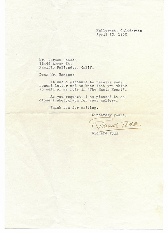 TODD, Richard (1919-2009). Actor who in 1949 received the Academy Award for “The Hasty Heart” which also starred Ronald Reagan. Typed letter signed, one page, refers to “The Hasty Heart.” Todd writes: “It was a pleasure to receive your recent letter and to know that you think so well of my role in “The Hasty Heart”... signed “Richard Todd.” Folded from mailing and a few minor creases........$67.50![]() |