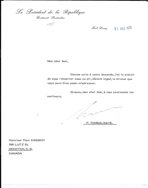 TOMBALBAYE, Francois (1918-1975). First President of Chad (1960-1975). Appointed the nation’s head of government after its independence on August 11, 1960. He rules as dictator until his assassination. Typed letter signed, one page, 31 March 1970, on the letterhead of The President of the Republic. Friendly letter complying with a request for his autograph. Signatures of Tombalbaye are considered scarce in any form. In fine condition.......... $295.00