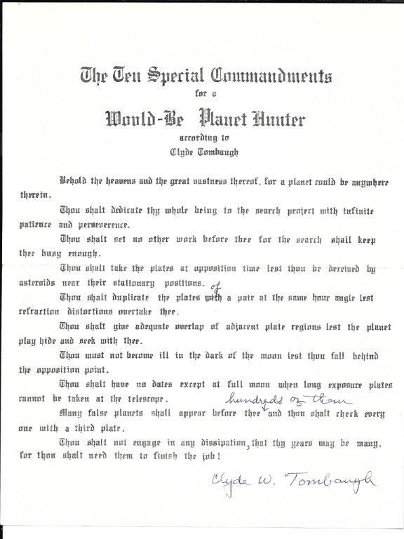 TOMBAUGH, Clyde W. (1906-1997). Astronomer, author. Discovered the ninth planet Pluto at Lowell Observatory, Flagstaff, Arizona in February 1930. He holds the distinction of being the only person in the 20th century to have discovered a planet. Printed document titled The Ten Special Commandments For A Would be planet Hunter According to Clyde Tombaugh. Tombaugh makes a few additions in his hand and signs his name with a full signature below. Very attractive for framing..................$225.00