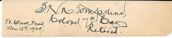 A very rare signature “S.R.H. Tompkins” adding in his hand: “Colonel 7th Cav. Retired. Ft. Clark, Texas, Dec.13, 1929” on a portion of an album page. A very rare and desirable signature. In excellent condition................$795.00