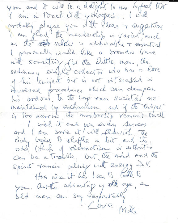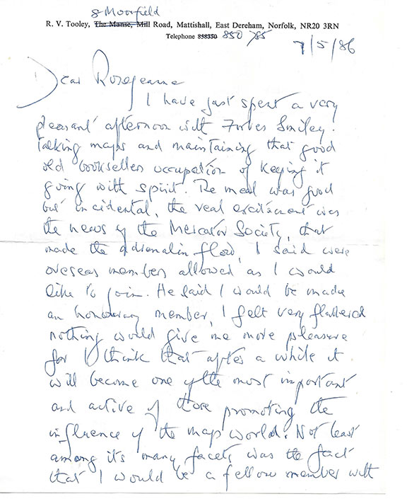 TOOLEY, R.V. (1898-1986). British map dealer, authority on early maps and cartography. Author of “Maps and Map Makers” founder of Map Collectors Circle and published “The Map Collectors Magazine.” He is one of the very few to describe how Antarctica has been depicted over the century. Autograph letter signed, two very full pages, on his name imprinted letterhead. Dated 7/5/86 just 100 days before his passing. He writes in part: “I have just spent a very pleasant afternoon with Forbes Society talking maps and maintaining that good old booksellers occupation of keeping it going with spirit.” He goes on to be happy that he has been made an honorary member of a society...”I felt very flattered nothing would give me more pleasure for I think that after a while it will become one of the most important and active of those promoting the influence of the map world...” He talks about more information about societies and their membership. Signed “Love Mike.” Anything signed by Tooley can be considered uncommon...$85.00
