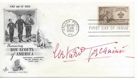 TOSCANINI, Arturo (1867-19570 Italian conductor, at times directed for the Metropolitan Opera and the New York Philharmonic. First Day Cover commemorating the Boy Scouts of America, Fine cachet of some boy scouts and a camp site. Affixed to this cover is a U.S. 3 cent Boy Scouts of America postage stamp cancelled First Day of Issue Valley Forge PA. JUN 30, 1950. Boldly signed by Toscanini in red ink with a 3.5” long signature. Light brushing to the last 3 letters of his signature otherwise in fine condition.....................$185.00