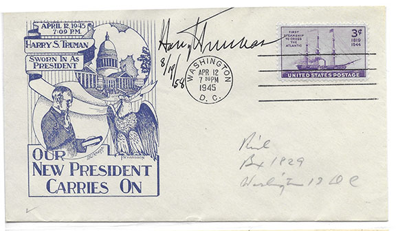 4) TRUMAN, Harry S. (1884-1972). 33rd President of the United States (April 12, 1945-Jan 20, 1953). Became President upon the death of F.D.R. Inauguration Day cover bearing a cachet of Harry Truman being sworn in as President. “Our New President Carries On.” Affixed is a U.S. 3 cent postage stamp of the First Steamship To Cross The Atlantic. Cancelled, Washington, D.C. April 12, 1945. Signed and dated by Truman: “Harry S. Truman 8/19/58.” In V/F to Mint condition. From the collection of Ralph Swap. Alaska...........$475.00