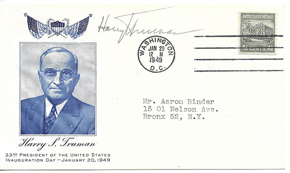 6) TRUMAN, Harry S. (1884-1972). 33rd President of the United States (Jan. 20, 1949-Jan. 20, 1953). Colorful Inauguration Cover January 20th, 1949, with a cachet of President Truman and crossed American Flags. Affixed is a U.S. 4.5 cent postage stamp of The White House. Cancelled, Washington D.C. Jan 20, 1949. Signed above the cancellation Harry S. Truman. Typed name and address to a collector in The Bronx. In V/F/Mint condition. From the Estate of Ralph Swap, Alaska ..................................$495.00