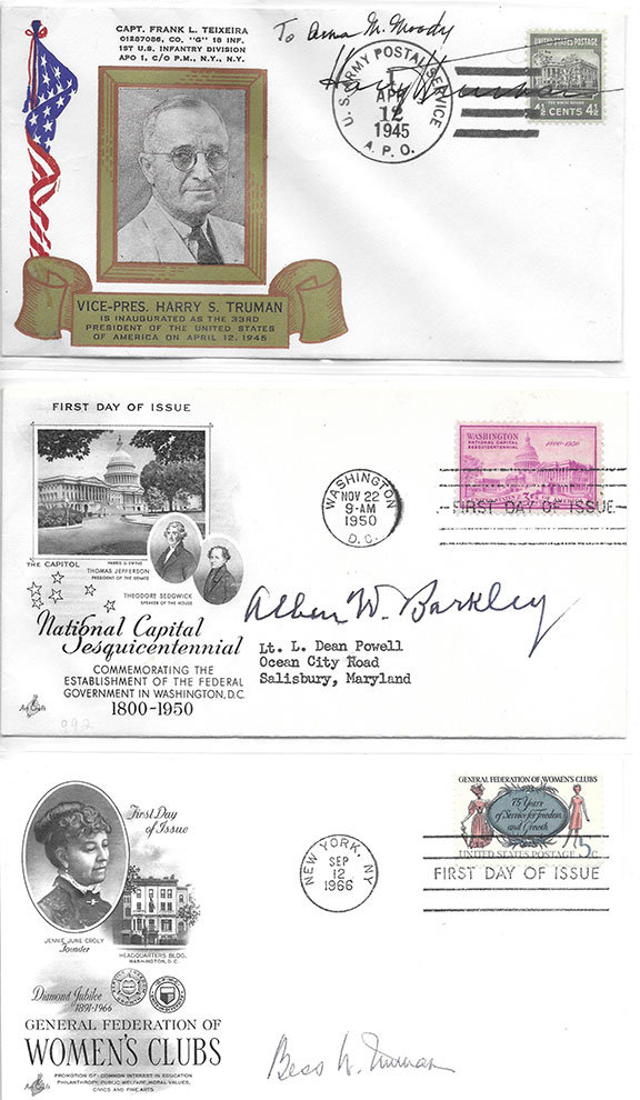 3) TRUMAN, Harry S. (1884-1972). 33rd President of the United States (April 12, 1945-Jan 20, 1953) Became President upon the death of F.D.R. Rare cover bearing a cachet portrait of Vice-President Harry S. Truman. Inaugurated as the 33rd President of the United States on April 12, 1945. Affixed is a 4.5 cent The White House postage stamp cancelled U.S. Army Postal Service, April 12, 1945. Inscribed and signed by Truman, as President: “To Anna M. Moody Harry S. Truman.” His signature runs through the postage stamp. Top left corner is a printed return address of Capt. Frank L. Teixeira. Together with a FDC commemorating the National Capital Sesquicentennial (1950) signed in full by Vice-President Alben W. Barkley. In addition is a FDC signed by First Lady Bess W. Truman commemorating General Federation of Women’s Clubs, 1966. All three covers in fine condition. From the collection of Ralph Swap, Alaska ..................................$625.00